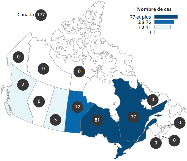 - Le nombre de cas signalés a augmenté par rapport à l'année précédente au Manitoba (+53 %) et au Nouveau-Brunswick (+71 %).